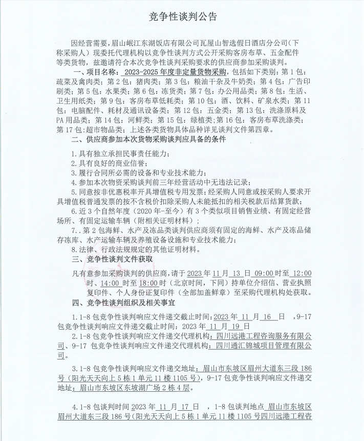 瓦屋山智選假日酒店2023一2025年度非定量采購(gòu)項(xiàng)目